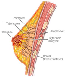 Mint a bevezetőből kikövetkeztethető mai bejegyzésemben a (női) mellet járom körbe. A mell az emlősök –beleértve az ember– törzsének felső hasi része. Mögötte található a mellüreg (mellkas). A „mell” gyakran az emlő szinonimájaként szerepel. Az emlő páros szerv. Izomszövete nincs, a mellkasfali izmok az emlők alatt helyezkednek el. Elsősorban a mirigyes állományból, valamint az emlő formáját adó zsír- és kötőszövetből áll. Vannak benne vérerek és nyirokerek. A mirigyes állomány a tejet termelő lebenykékből (lobulusok), illetve a tejet összegyűjtő és az emlőbimbóhoz elvezető kivezető csőrendszerből, tejcsatornákból (duktuszok) áll. A tejmirigyek az utódok táplálását biztosítják. Az alábbi képen jól látható felépítése: