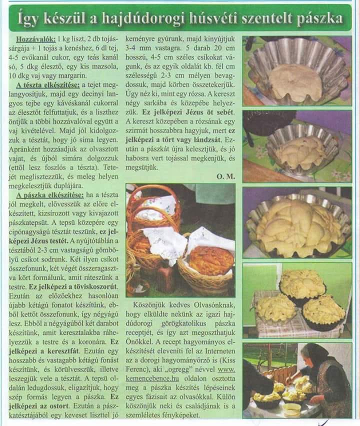 Nagycsütörtökön, lusta háziasszonyoknál nagyszombaton (nagypénteken tilos sütni!) készül a húsvéti pászka is. A pászka (mácá, macesz) úgy él a köztudatban, mint kovásztalan kenyér. Liszt és víz keveréke. Helyes elgondolás, de itt görögkatolikusról van szó! A pászka az kalács. Nemhogy nem kovásztalan, hanem kelt tésztából készül és a család nagyasszonya süti ki, mindenféle mágikus szertartások közepette, mert ha nem sikerül a kalács! Bármilyen “hiba” szerencsétlenséget jelez a családnak. Külön pászkasütőformát használnak hozzá.